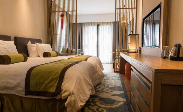 3、客房??头恐凶铌P(guān)頭的無疑是一張和緩舒適的大床了??头恐械乃械脑O(shè)計都要圍繞床來睜開。以床為核心設(shè)置設(shè)備放置床頭燈和簡略的桌椅。一個開閉柔柔空間夠大的衣柜可以放置參觀者的全數(shù)行李,也能儉仆室內(nèi)空間。